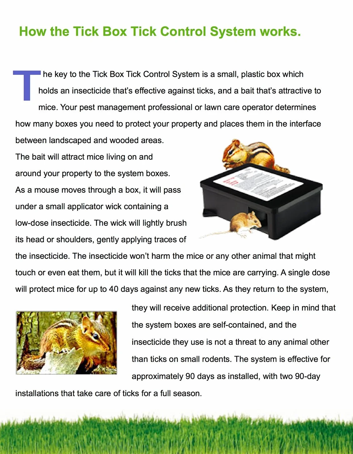 The TICK BOX® Tick Control System is a targeted tick-control solution developed using research supported by the Centers for Disease Control and Prevention. Unlike traditional spraying methods that focus on killing ticks directly, this system targets the primary hosts responsible for infecting ticks, white-footed mice and chipmunks.